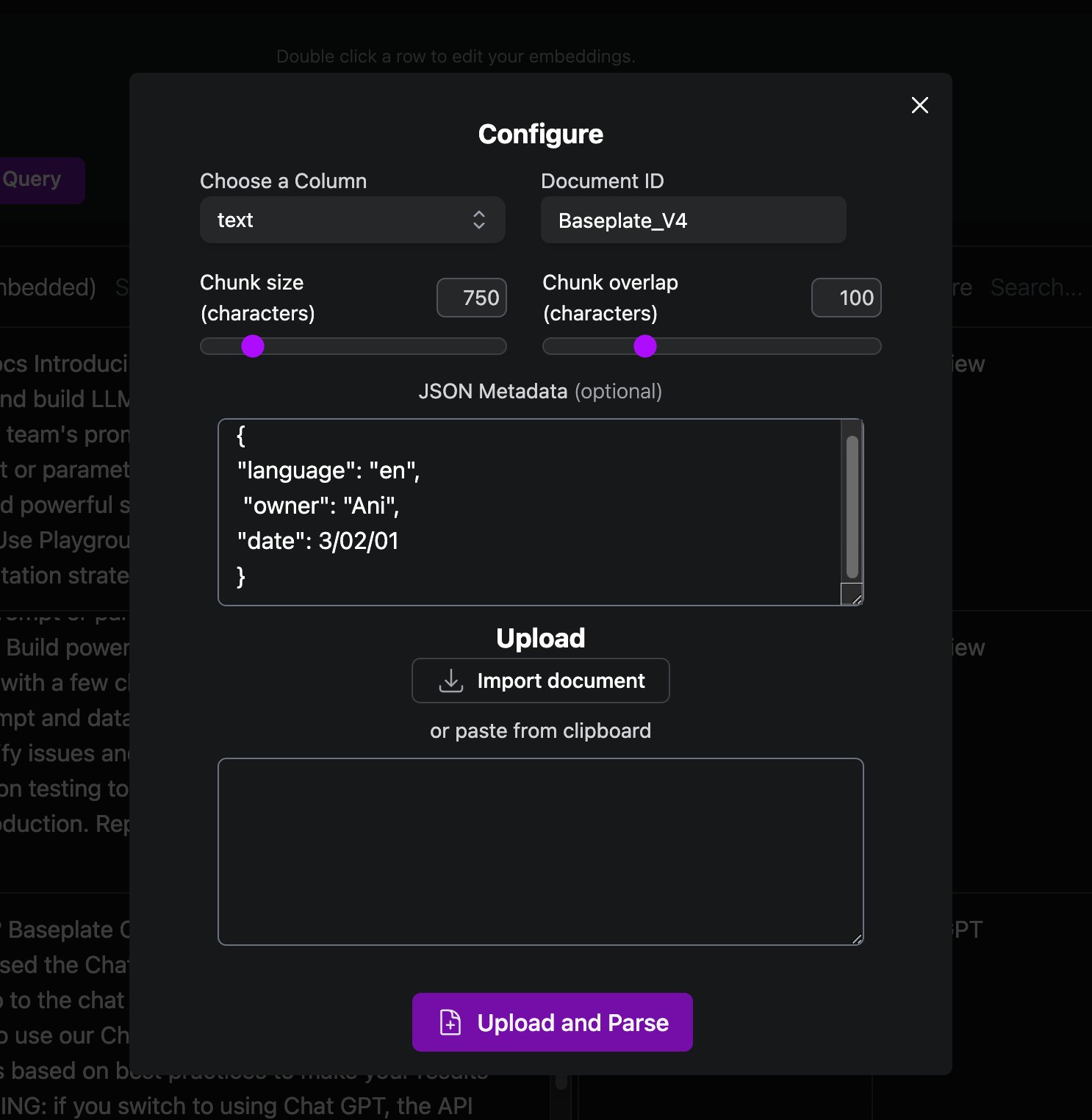 You can use Baseplate’s built in parsing capabilities to break documents into chunks for embedding. Specify a chunk size and which column to add the chunks to, and we’ll do the rest - Add context chunk-by-chunk