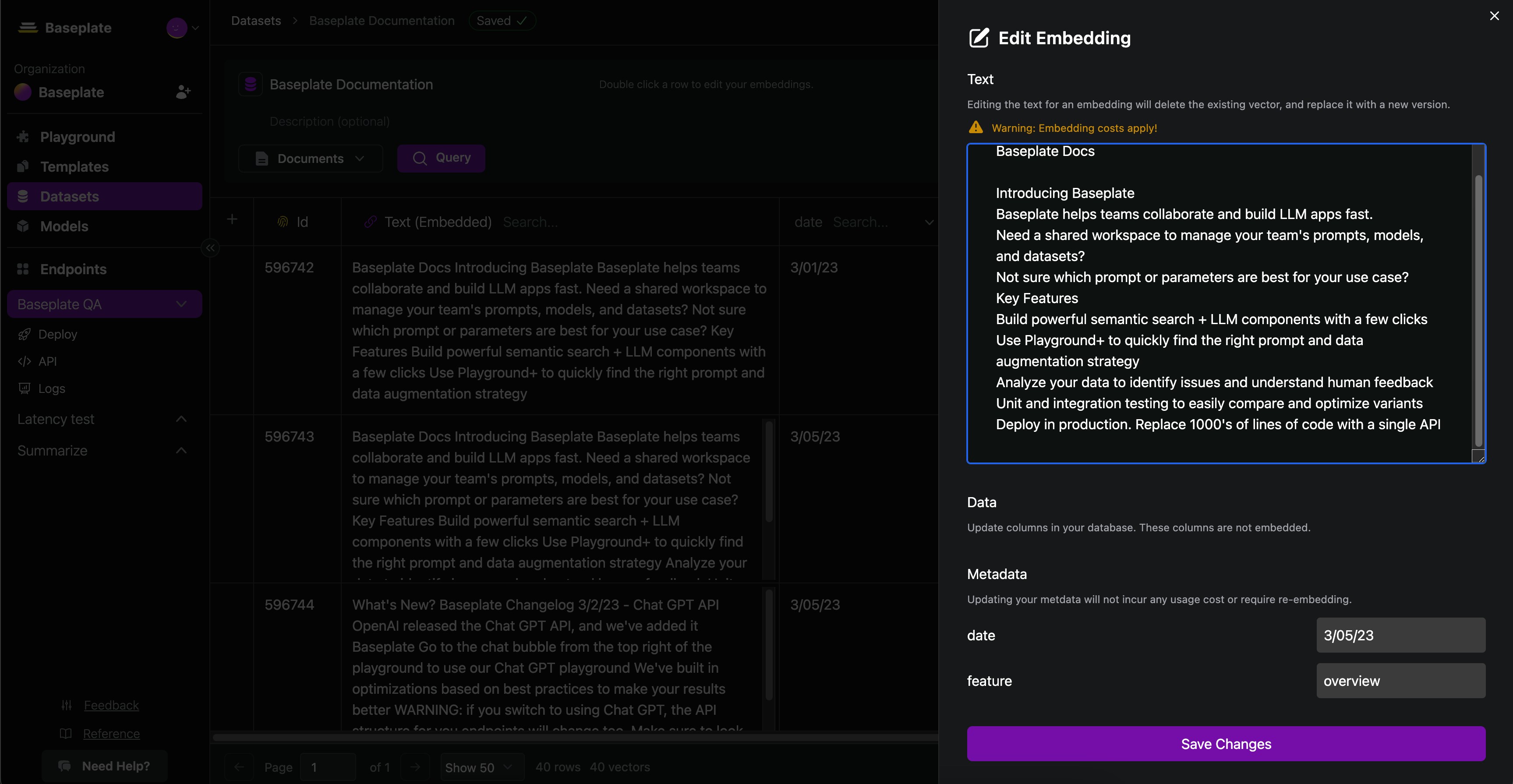 For more nuanced indices, upload rows to Baseplate via API once you’ve chunked them
